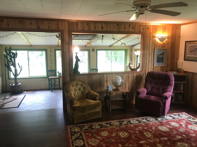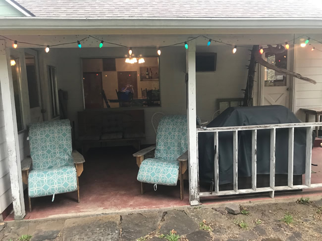The North Umpqua Retreat Guesthouse is a large cottage-style home fully-furnished and well-appointed for rent at daily, weekly, and monthly rates. It is about 1,200 square ft with 2 queen bedrooms, 1 bathroom, and spacious well-equipped kitchen, dining area, living room, indoor and outdoor patios, and laundry facilities. It has both original and custom touches like refinished wood floors, native wood paneling and window trim, antique lamps, and local but famous artworks. It has a private drive, ample parking (e.g. room for boat and trailer), gas barbeque grill, and spacious yard with a separate outdoor deck that overlooks the private reach of river and quiet old-growth forest beyond.